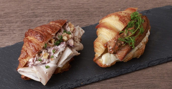 ディル風味の自家製ドライトマトのソースとマッシュポテトを添えた、無塩せきベーコン(ハムと同様の素材のみ使用)のクロワッサンサンド